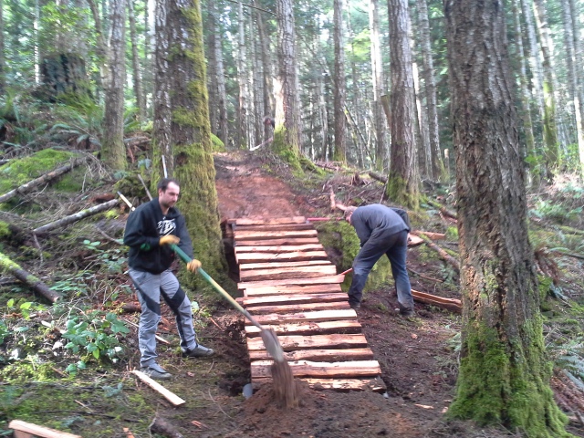 Update from Tom Rutherford March 14, 2015: With 9 or 10 sets of hands on deck, the work on the lower part below jump landing was completed before 1 pm, hampered somewhat by the muddy conditions thanks to all night rain. So lower part is connected with a big berm and cedar bridge onto Coltsfoot. Excavation holes were nicely covered up and many ferns replanted here and there. However, until muddy sections dry out it is not rideable and more material may have to be brought in after it all settles. Later in the afternoon, a few hardcores gathered to face the challenge. Fearless Case led the way and nailed the jump twice with the report that “surprisingly, it all worked”. Jody was next and treated onlookers Case, Nigel and Dad to a spectacular overshoot. He couldn’t hold the landing (approaching the bottom flats) and ended up in a tangle of bike and mud and thankfully no injuries. I’m not sure if anyone else took a stab at it later on. Landing could use some drying out as its pretty soft. All for now.