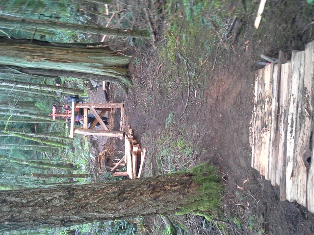 One of the box culverts placed was of an experimental nature: instead of being assembled from cedar planks we found a cedar log that had been hollowed out into a “U” shaped channel. We were curious to see if this type of culvert could work as there are many of these types of cedar logs on the ground out in the wood. As of the time of writing the log culvert has been in use for four years and continues to perform well.