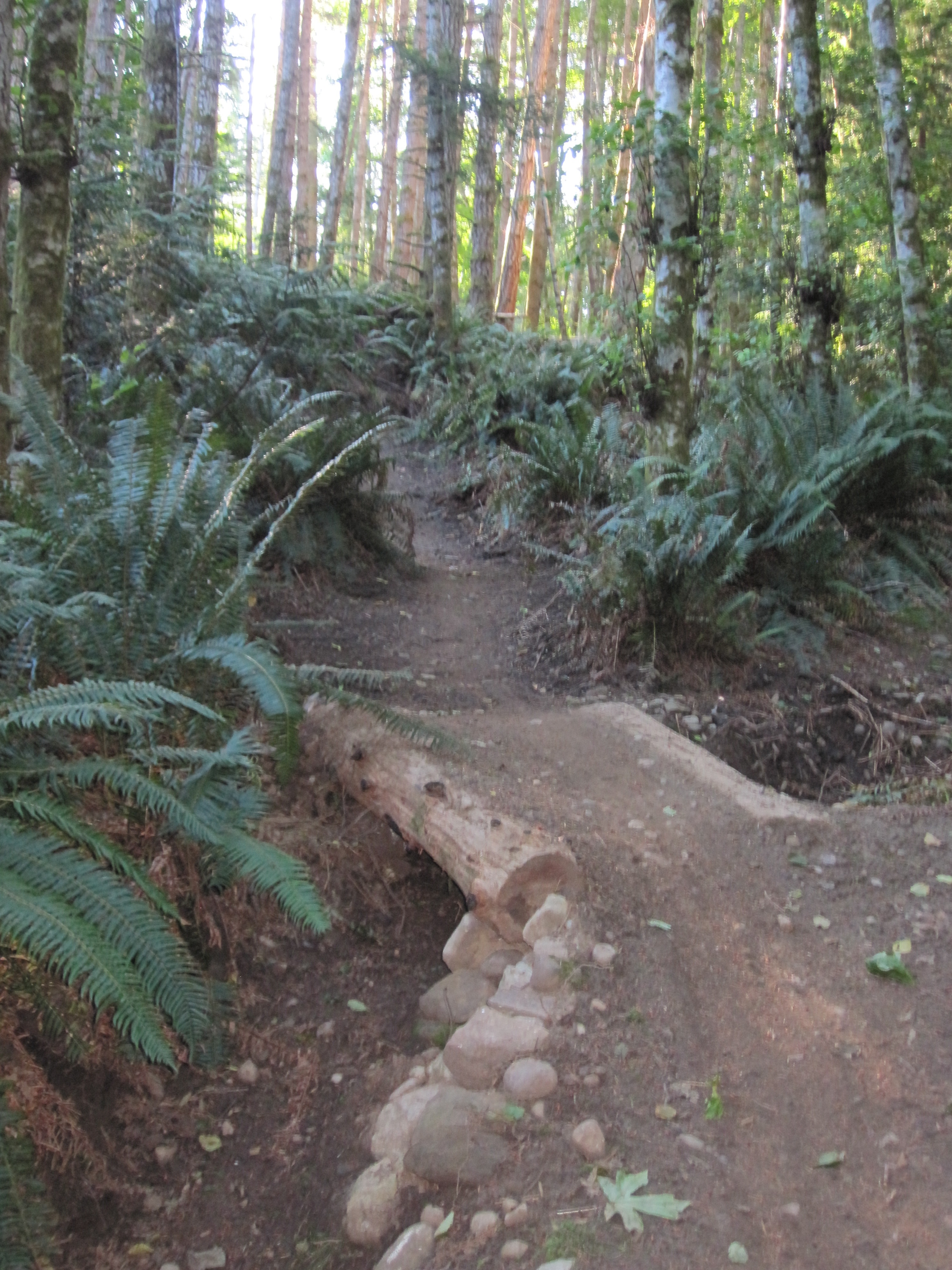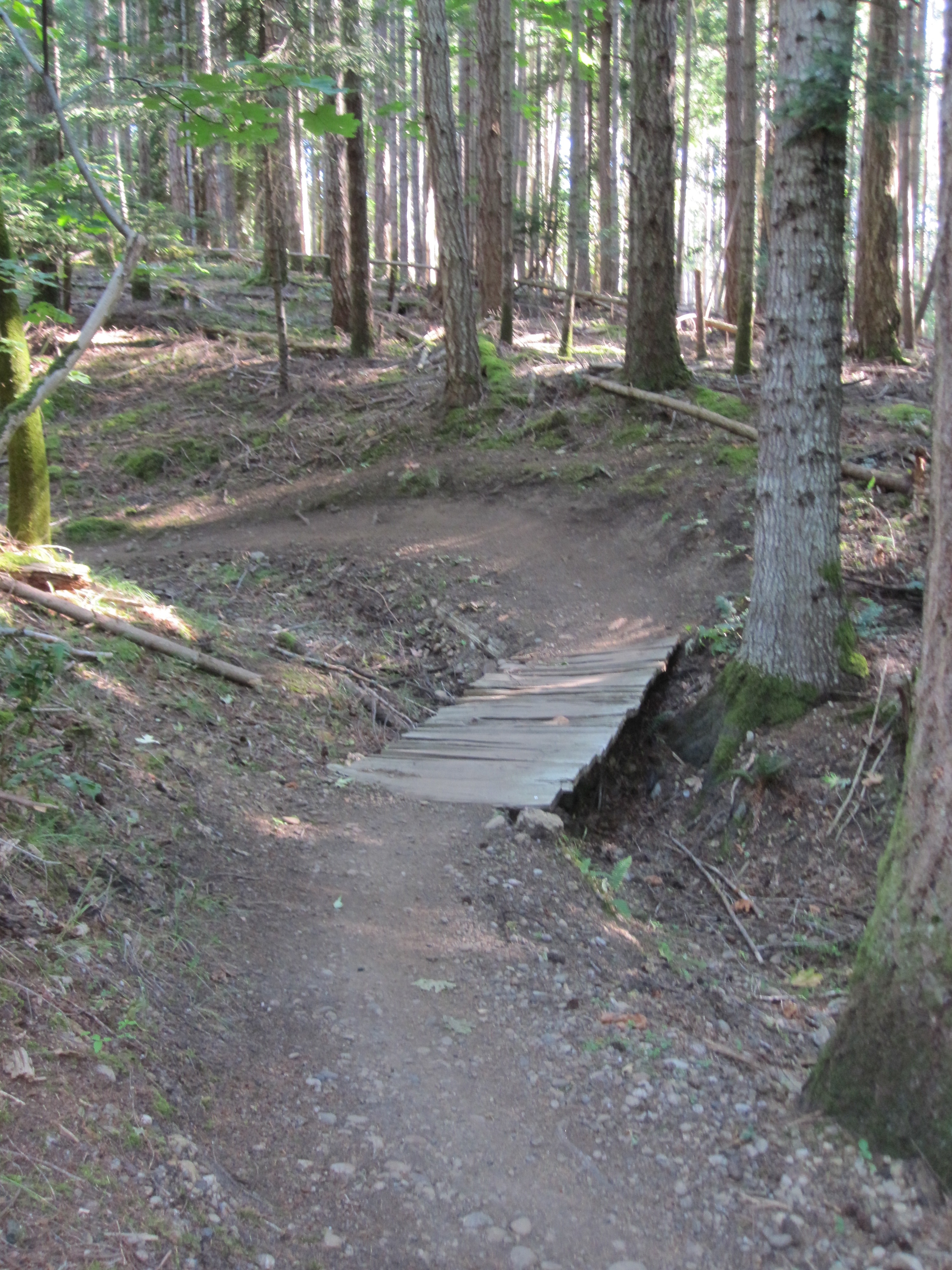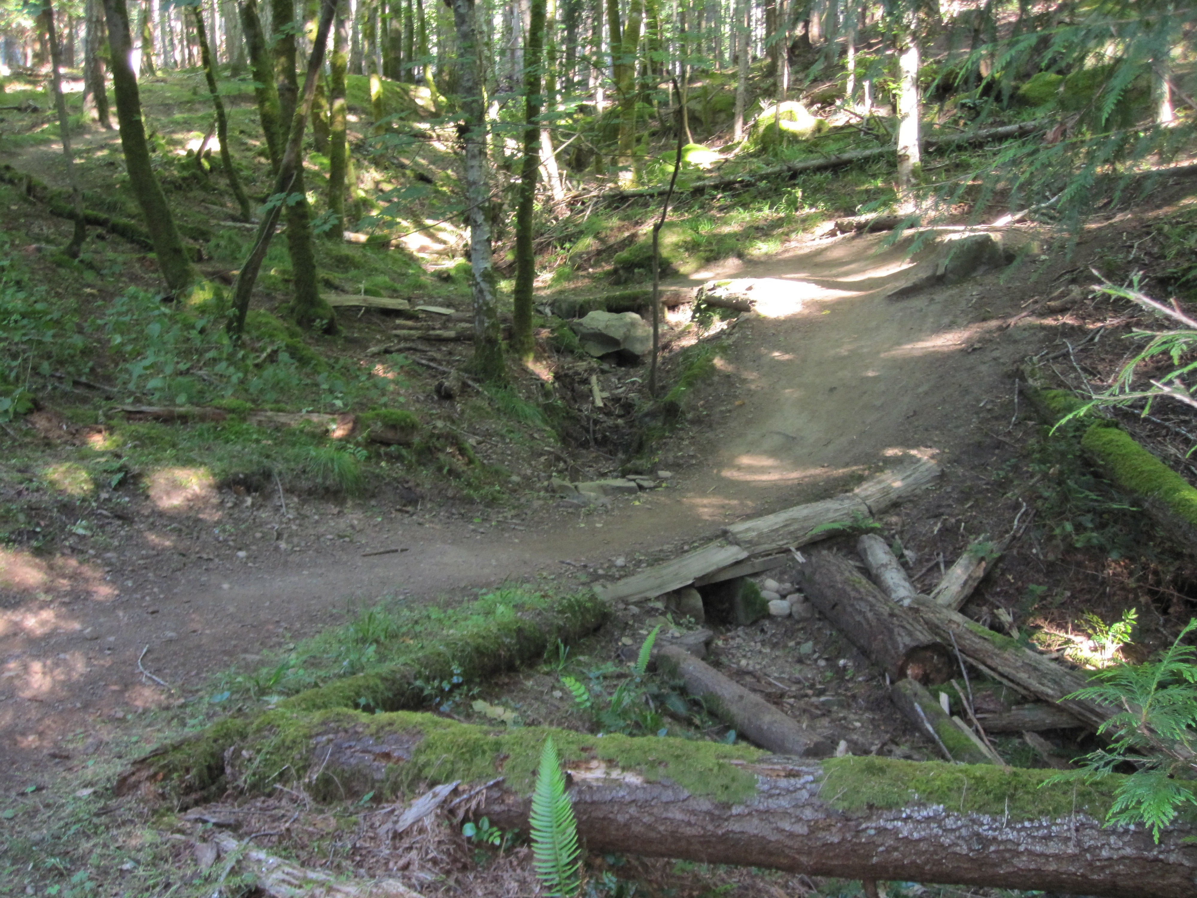 We reworked the approach trail to be sustainable and provide a smoother approach to the main jump over Washing Machine. This jump is now a constructed cedar ramp with a take-off height of over six feet. The landing area has been cleared and buffed. It now includes a ride-out trail onto Coltsfoot. The jump has been tried and all agree that it is one of the biggest on Hornby.