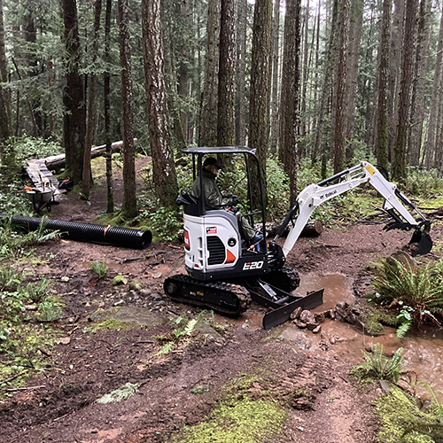 Yer Mom is Hornby’s only Double Black Diamond trail. It has a number of elevated wooden stunts but some of these have started to decay. We’ve decided to replace a stretch of them with a new dirt-jump section. While it would be nice to rebuild the wooden stuff, we have to recognize that anything made from wood is going to rot eventually. We rented a small tracked excavator for the dirt moving, which also proved to be useful in the placement of a much-needed culvert.